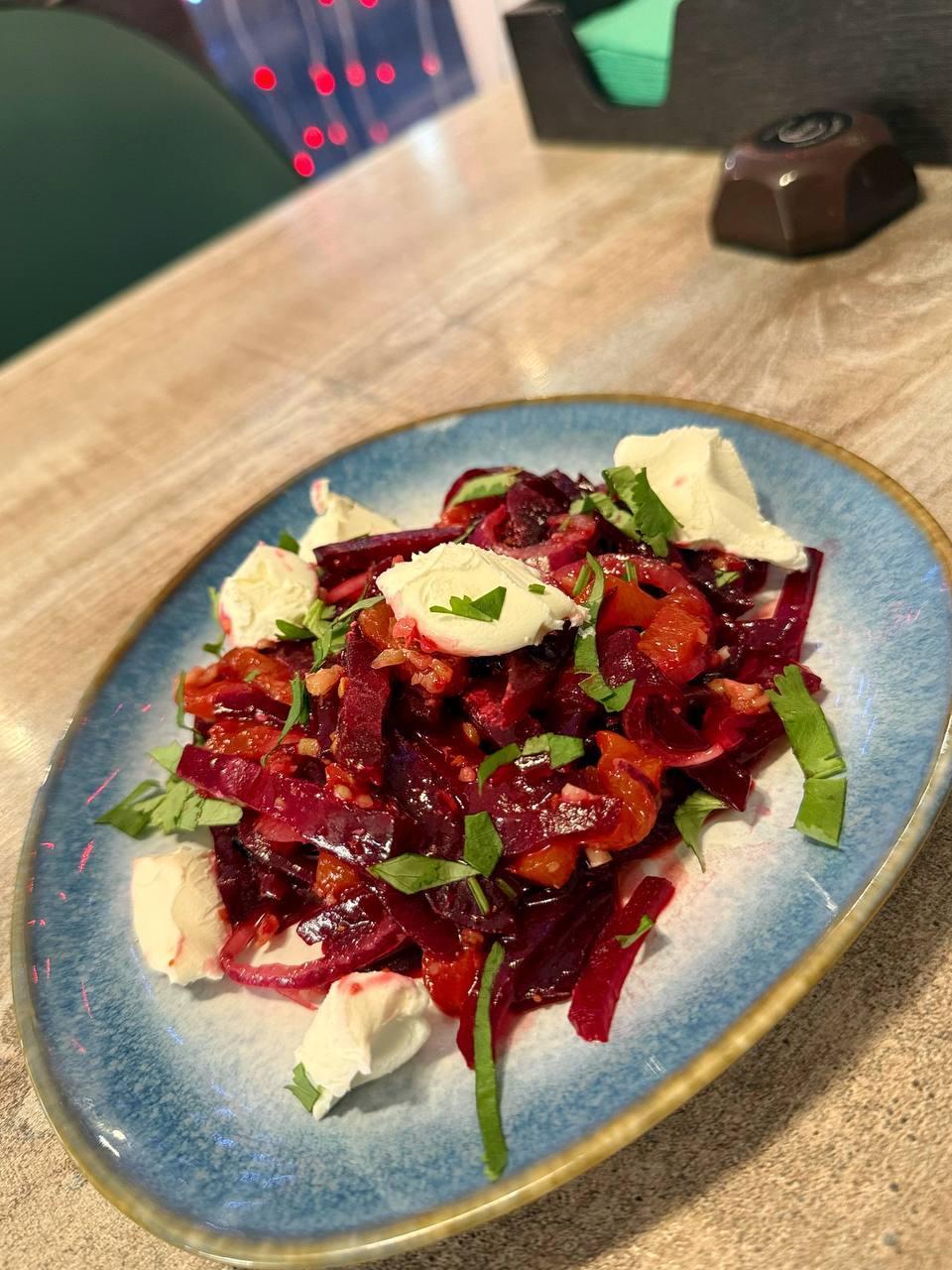Перец болгарский печеный,свекла,лук,кинза,орех грецкий,сыр творожный
