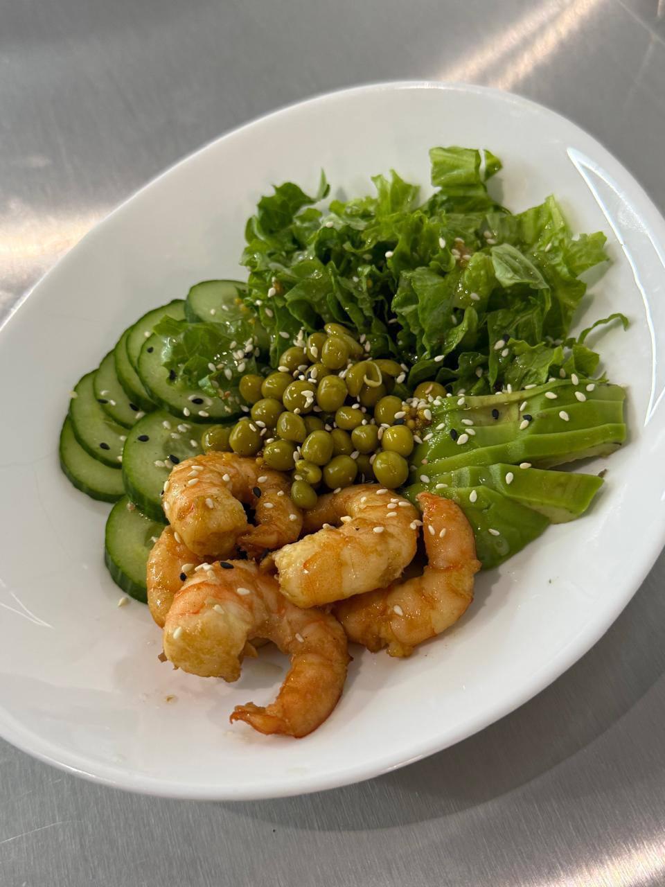 Лист салата,креветки,авокадо,огурец,зеленый горошек,греческий соус